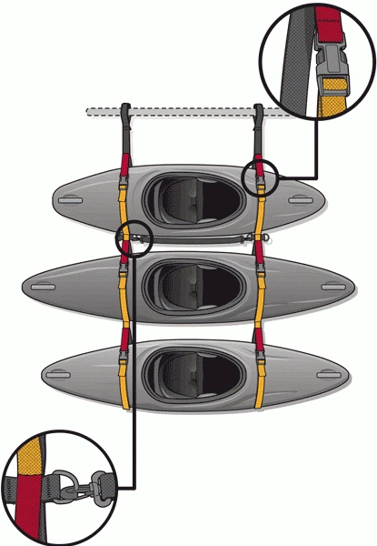 Endlich ist das Lagerproblem der Kajaks gelöst: Mit nur zwei Fixpunkten lassen sich 3 Boote schnell und raumsparend unterbringen. Das Bootsregal ist mit wenigen Handgriffen montiert.